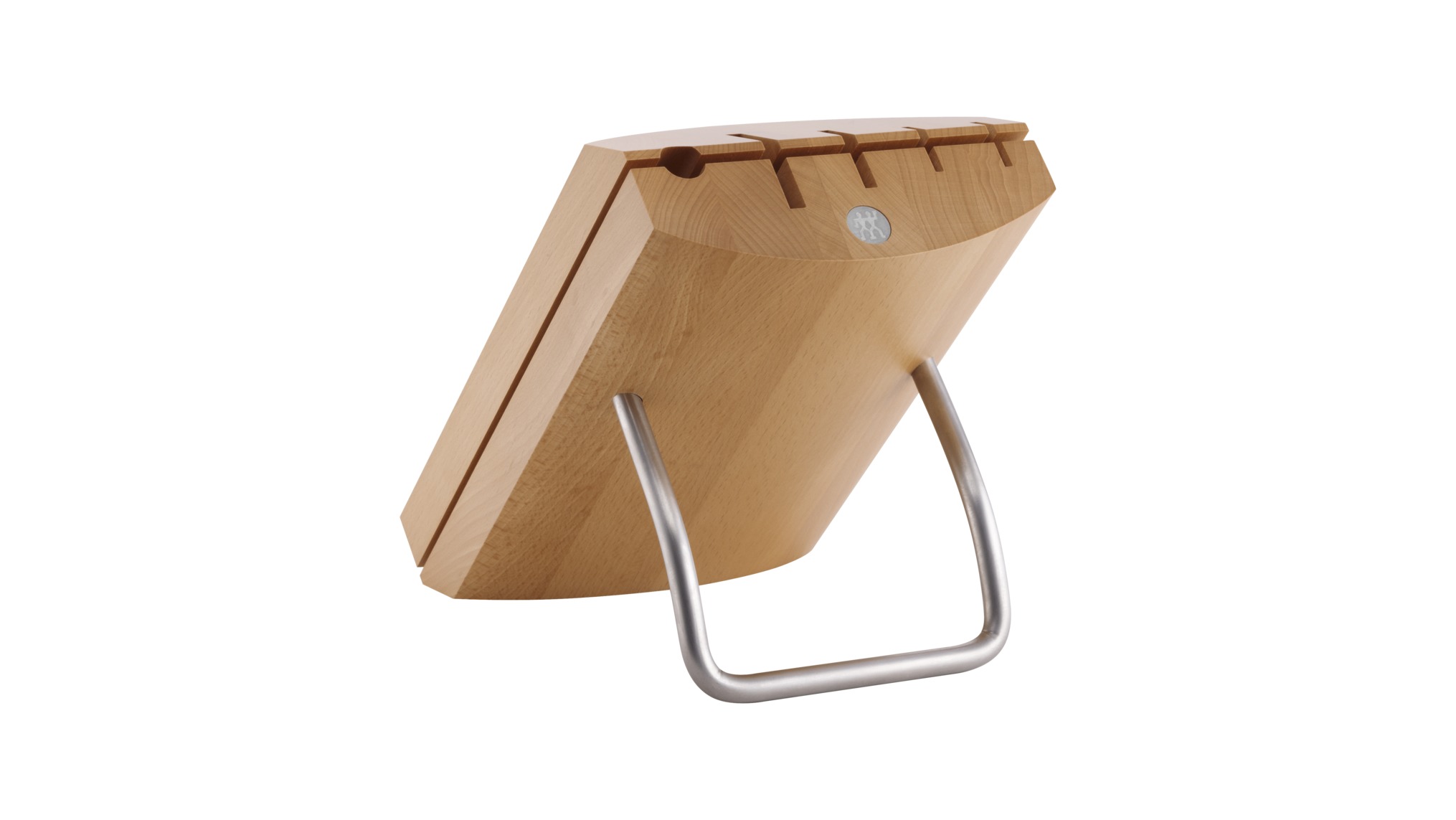 Blok vyrobený z bukového dřeva v kombinaci s nerezovou ocelí. Má ideální sklo, aby nože byly vždy dobře přístupné a zároveň bezpečně uložené.Prostor po uložení 4 nožů a ocílky.