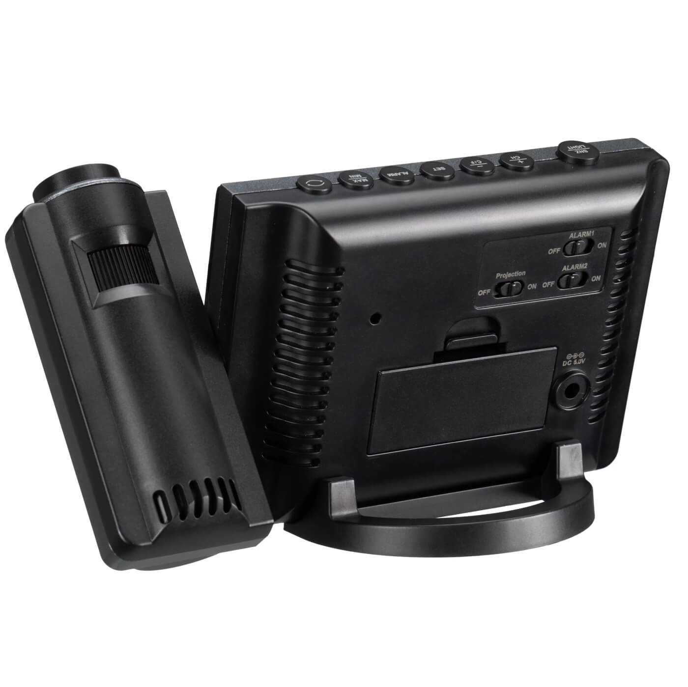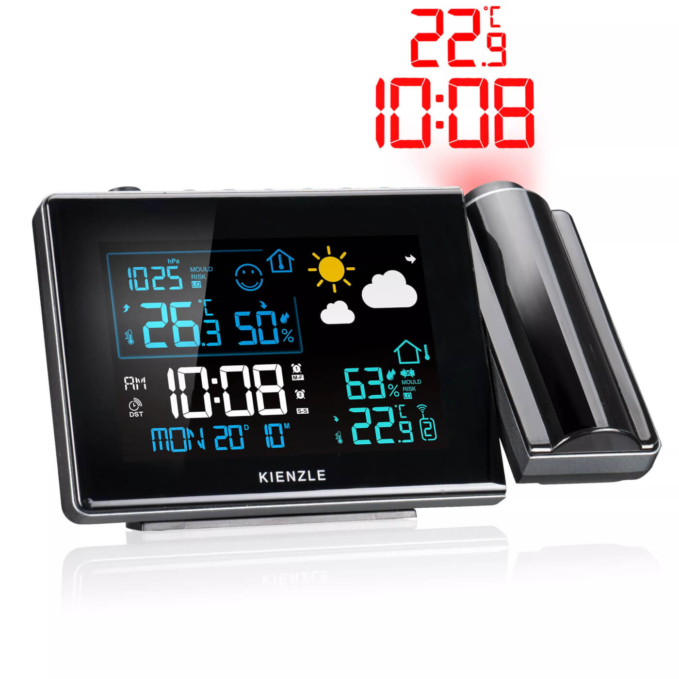 Barevná meteorologická stanice KIENZLE Home s projekcí spojuje moderní design a praktické funkce pro sledování počasí. Čas i teplotu promítá přímo na stěnu nebo strop, takže je máte neustále na očích. Barevný displej zobrazuje vnitřní i venkovní teplotu, vlhkost, tlak, předpověď počasí a paměť pro min./max. hodnoty.