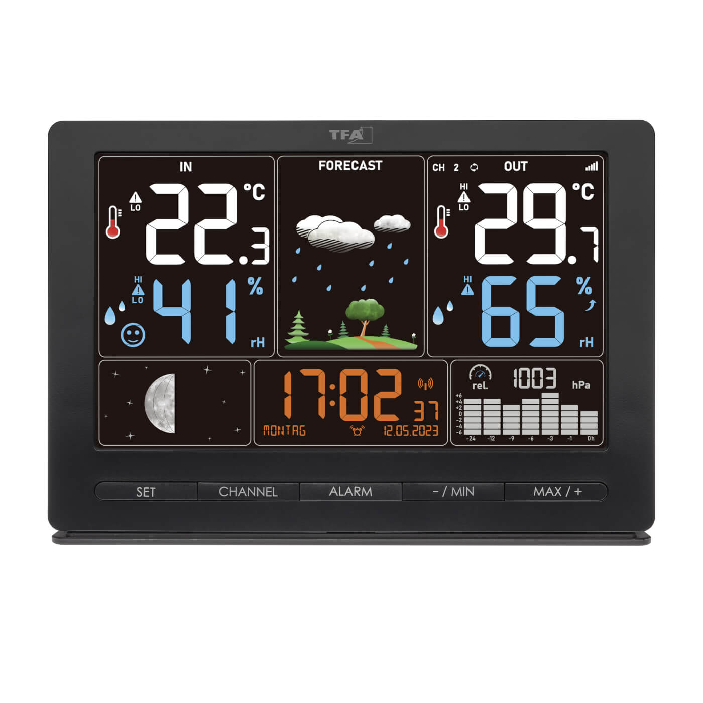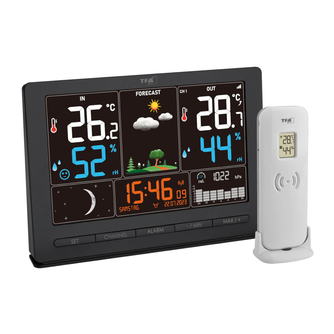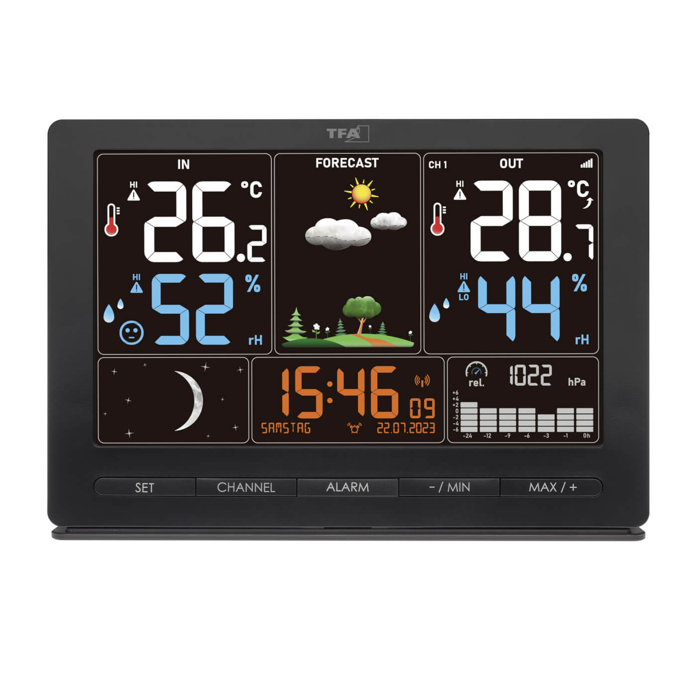 Díky rádiem řízeným hodinám budete mít vždy přesný čas, datum a den v týdnu – a to hned ve šesti jazycích. Stanice nabízí také symbolovou předpověď počasí, fáze Měsíce a navíc v centru displeje se měnící obrázek krajiny podle ročního období, který oživí každý interiér.