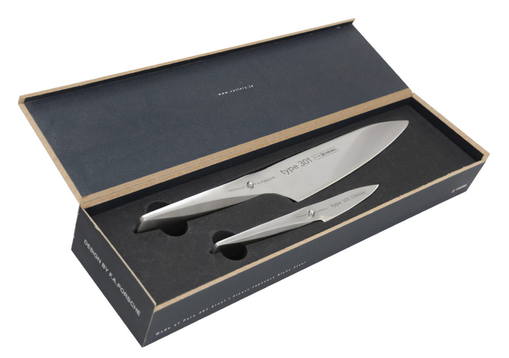 Sada dvou nožů P-918 Chroma typ 301 obsahuje šéfkuchařský nůž P-18 o délce čepele 20 cm a loupací nůž P-09 ve vysoce kvalitním dárkovém balení.