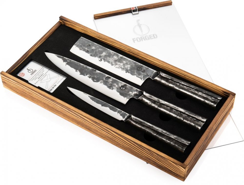 Univerzální nůž: Menší verze kuchařského nože. Ideální pro krájení zeleniny nebo menších kousků masa. Díky úzké čepeli dokáže řezat velmi přesně.