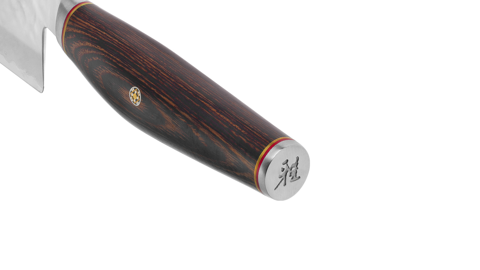 Rukojeť je vyrobena tvrdého exotického dřeva pakka a přirozeně doplňuje elegantní tvar čepele. Decentní mozaika jen dokresluje mimořádnou kvalitu rukojetí. Nerezová patka s logem Miyabi vyvažuje celý nůž a dodává mu punc kvality a elegance.