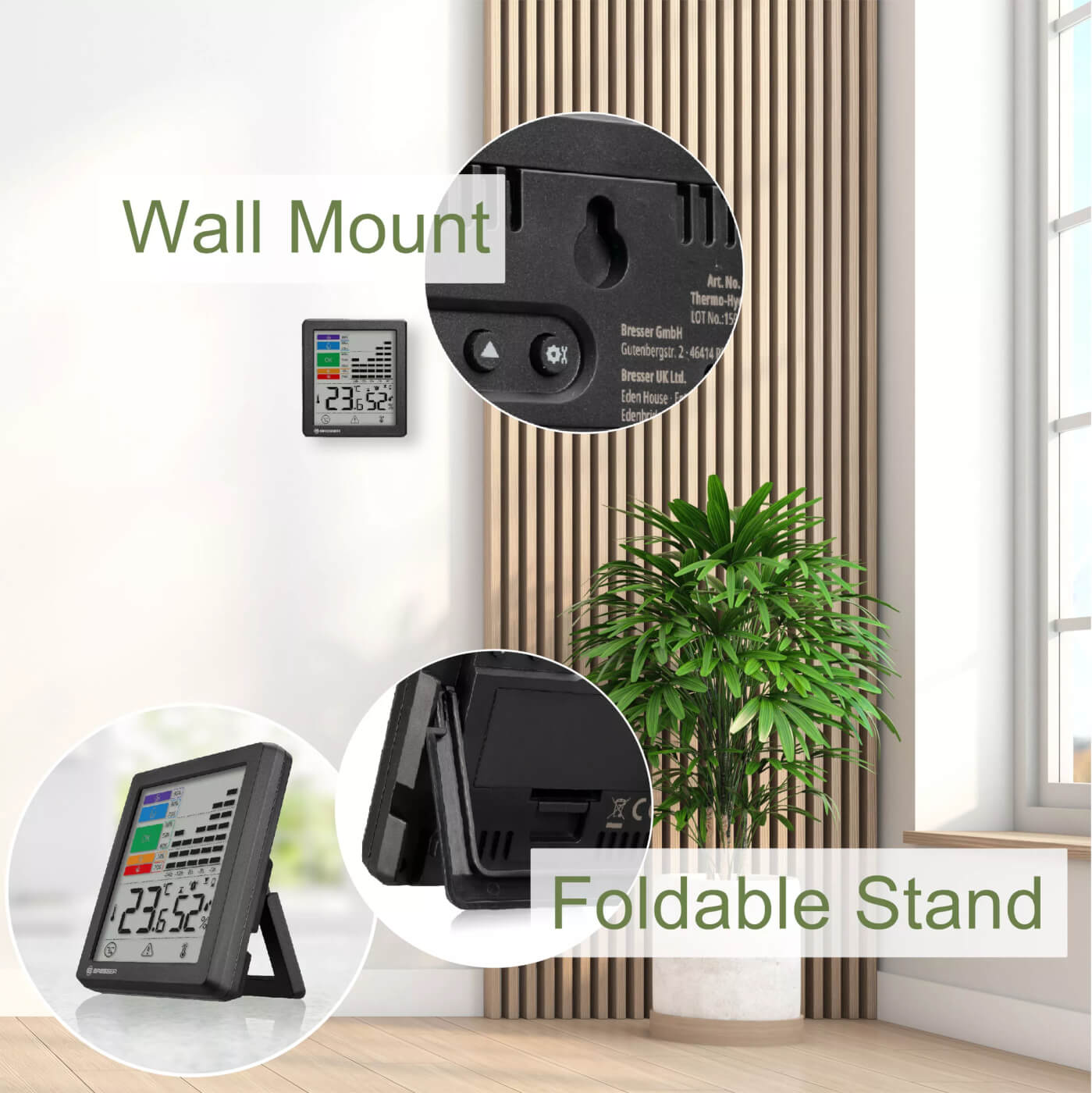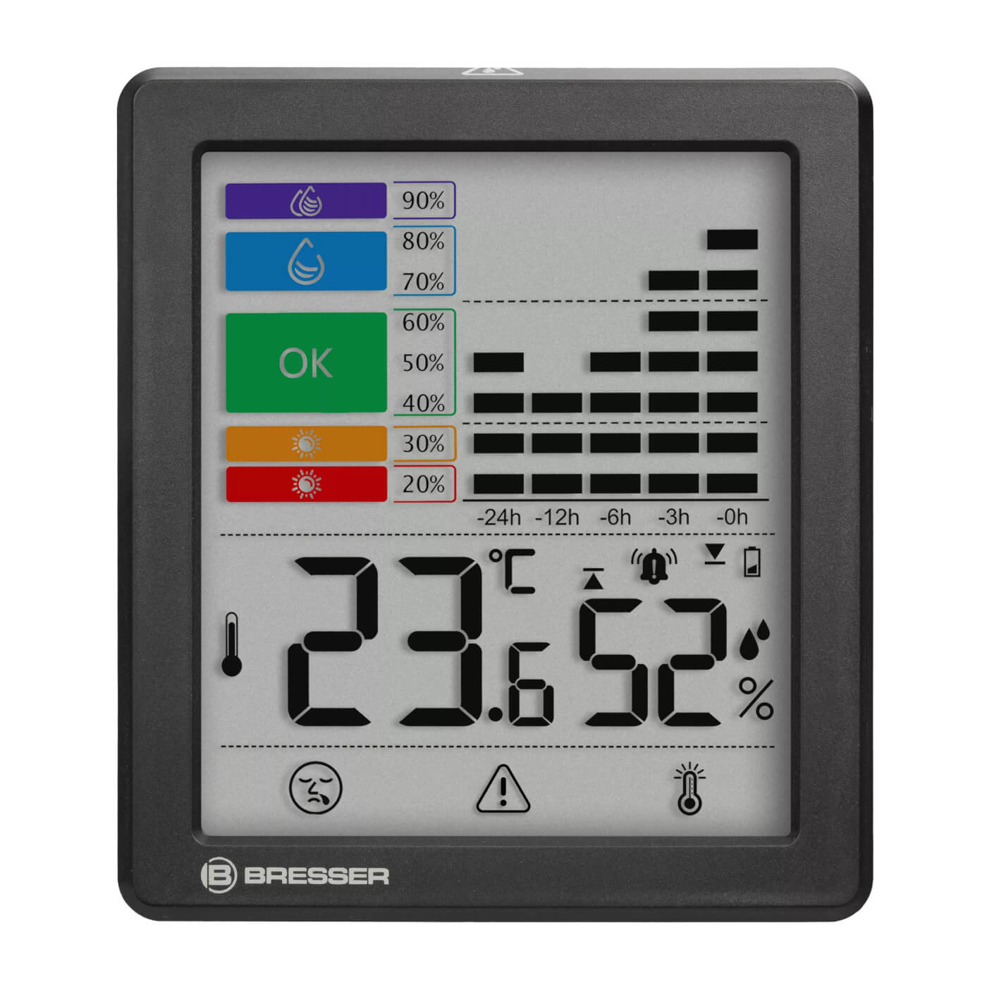 Udržujte své zdraví i pohodlí pod kontrolou – teploměr a vlhkoměr BRESSER přesně sleduje podmínky v místnosti a díky praktickým varovným funkcím vám dá vědět, kdy je čas větrat, topit, zvlhčovat nebo odvlhčovat.