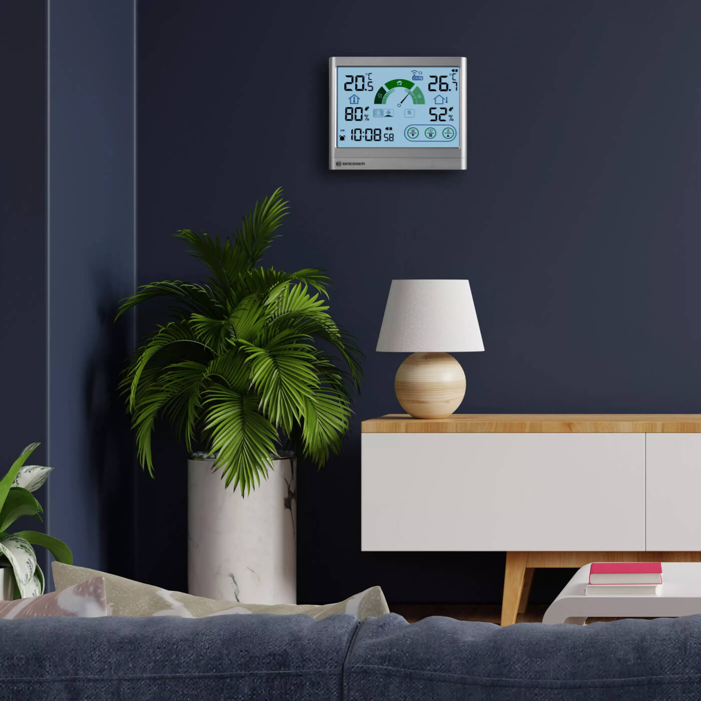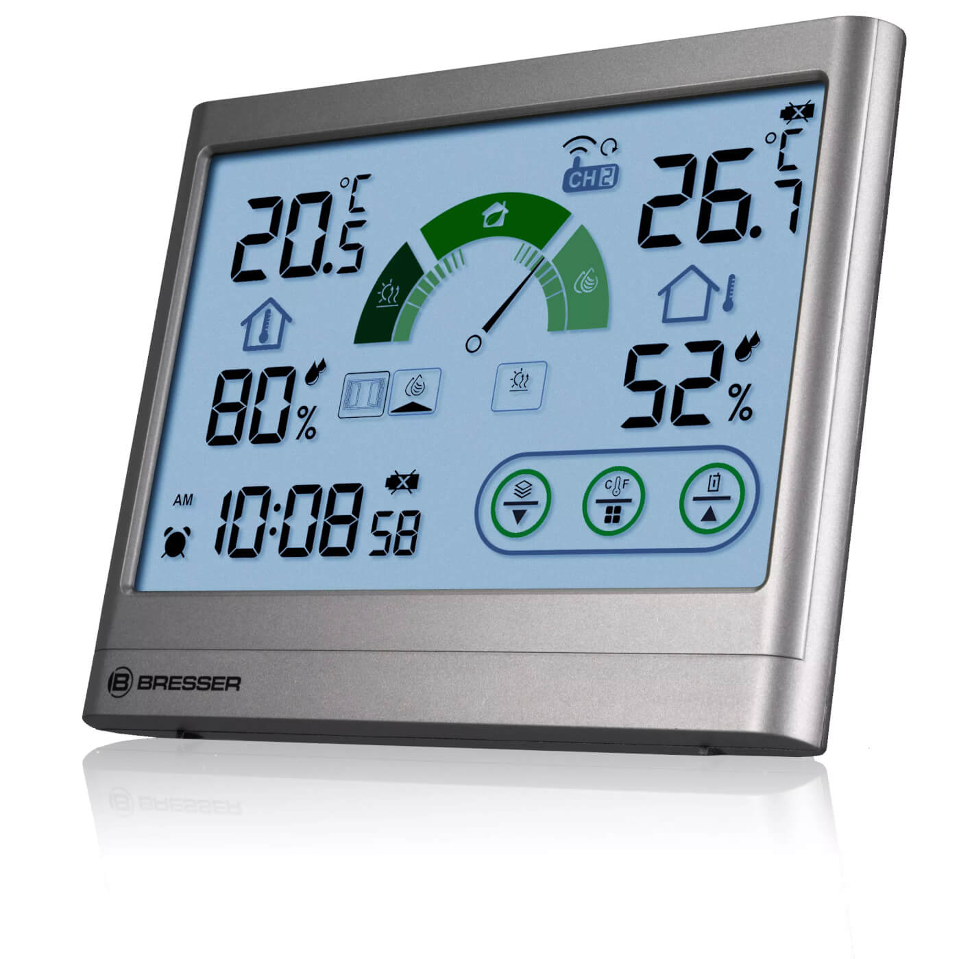 S termo-hygrometrem BRESSER VentAir H budete mít vždy jasno, kdy je čas vyvětrat. Přesně změří teplotu a vlhkost a na elegantním displeji vám hned ukáže, jak se u vás doma dýchá. Díky praktickému indikátoru komfortu okamžitě poznáte, jestli je vzduch příjemný – nebo je třeba jednat.