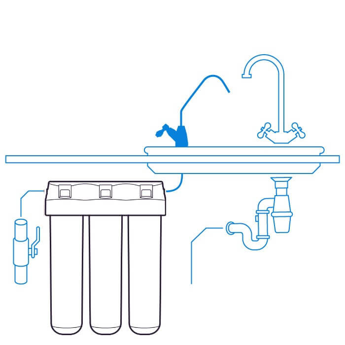 Poznámka: Pokud nechcete mít samostatný kohoutek a vrtat díru do kuchyňské desky, můžete si k filtru dokoupit trojcestnou baterii. Od klasického kohoutu se liší tím, že má připojení jak na teplou a studenou vodu, tak i na filtrovanou. Na čerpání filtrované vody obsahuje přepínač navíc.